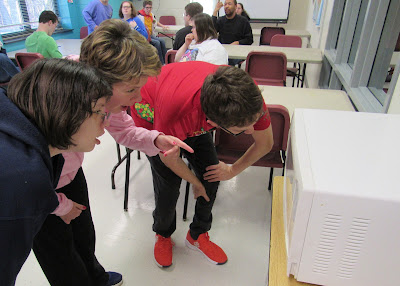 Finally on Friday, we did something kind of weird. We had run out of time on Wednesday, but today was the day...we were about to "cook" Ivory soap in a microwave! We got the idea from Sam's mom, who saw the idea on Facebook. She donated the soap, and probably couldn't wait to see our results! (Thanks for the idea and the soap, Teri! It's safe to do at home if you want to try it yourself!) In researching the project, Lisa found an extension that involved adding toilet paper and water to the Ivory after it's microwaved. So, Sam gathered the materials and we headed to the kitchen.