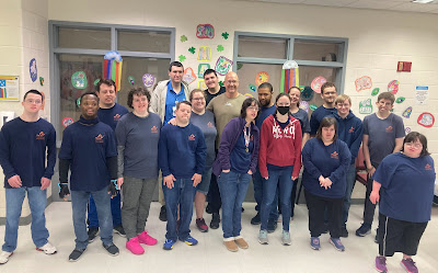 This morning we had a surprise visitor! Ben Conner, who used to live in Williamsburg and was a Young Life Capernaum leader, stopped by to see friends who used to be in his program, and meet some new ones who are in ours. Michelle, Drew, Alexis, Xavier, Liz, Sam, Patrick, and, in the back Carol's sons David and Matt, spent many of their teen years involved in Capernaum activities with Ben, and have many fond memories of their time together. Ben eventually moved to Michigan, where he continues to be an advocate for the disability community. His Capernaum friends aged out of Young Life, but Ben's mom still lives in town and every chance he gets, Ben tries to touch base with them.