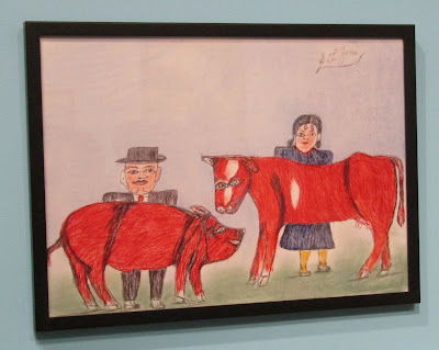 This is a ballpoint ink and pastel drawing by an artist from West Virginia named Shields Landon Jones. We thought he was good at drawing, but wondered why the pets were nearly as tall as the people?! We also learned from Christina that pigs are very neat animals, who have specific spots away from where they sleep for going to the bathroom, and cows are nosy animals! Thanks for those interesting facts, Christina!