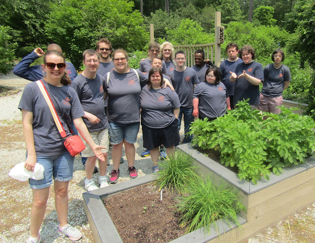 Today is National Gardening Exercise Day, which celebrates that gardening is a good form of exercise. Since our MGs weren't here to help us with gardening, we turned it into "Excercise In the Garden Day!" We walked around the garden, pausing at plants, flowers, or trees that might inspire us to create an exercise movement. (That should say inspire Lisa, who came up with this idea!) Here, we were stretching from side to side with our arms bent, trying to imitate a small tree with branches that bent.