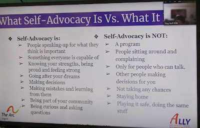 Just as we finished up lunch, our guests from The Arc of Virginia arrived to give us a presenation on Self-Advocacy. Up in the corner of this picture is Shay, who Zoomed in from Roanoke to join the presentation.
