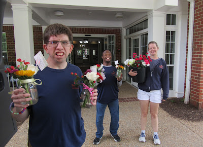 We made small flower bouquets for Peggy and Ursula using some of the flowers we got from Trader Joe's for the Commonwealth Senior Living (CSL) arrangements. We wanted to thank them for always making delicious treats for us (today Peggy brought oatmeal raisin cookies), and also wish them a Happy Mother's Day! We appreciate their friendship and support of our work, and love volunteering alongside them and Joel, Tom, and Thom! Thank you Devin and Liz for your on-the-spot kind words to Peggy and Ursula. Great job, as always!